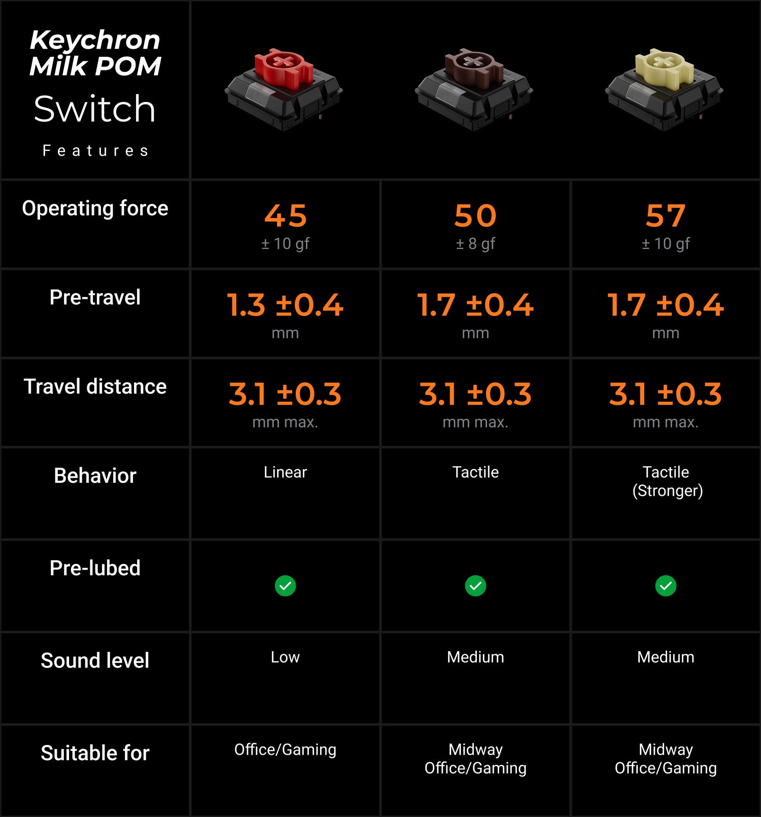 Crafted with advanced self-lubricating POM and POK materials, the Keychron Milk POM Switch delivers an impressively smooth feel right out of the box and becomes even smoother over time with every keystroke. Pre-lubed for added consistency and paired with a deeper, more resonant thock in a low-profile design, it offers a refined and reliable typing experience across linear Red and tactile Brown and Banana options.
