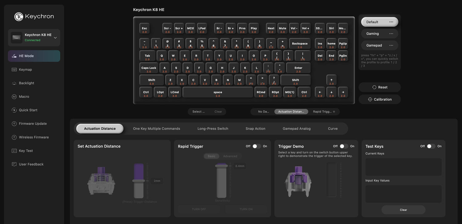 Experience the power of Analog Mode on your K8 HE, bringing game controller-like precision to your keyboard. This mode enables variable inputs instead of the usual on/off signals, letting you achieve more fluid and dynamic control.