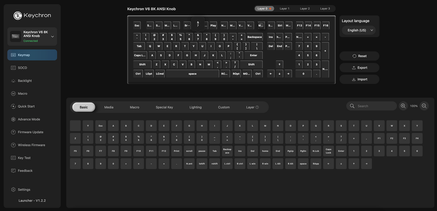 The open-source QMK firmware means endless possibilities for key remapping, macros, shortcuts, and more. Now you can easily customize each key with the Keychron Launcher web app.