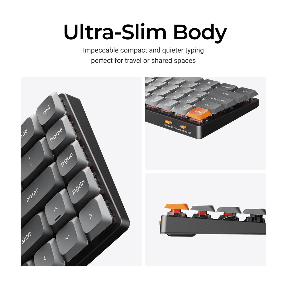 The innovative low-profile Gateron switch is 31% slimmer than conventional normal profile switches makes the aluminum body K7 Max one of the thinnest wireless mechanical keyboards in the world. While still delivering a distinguished tactile response.