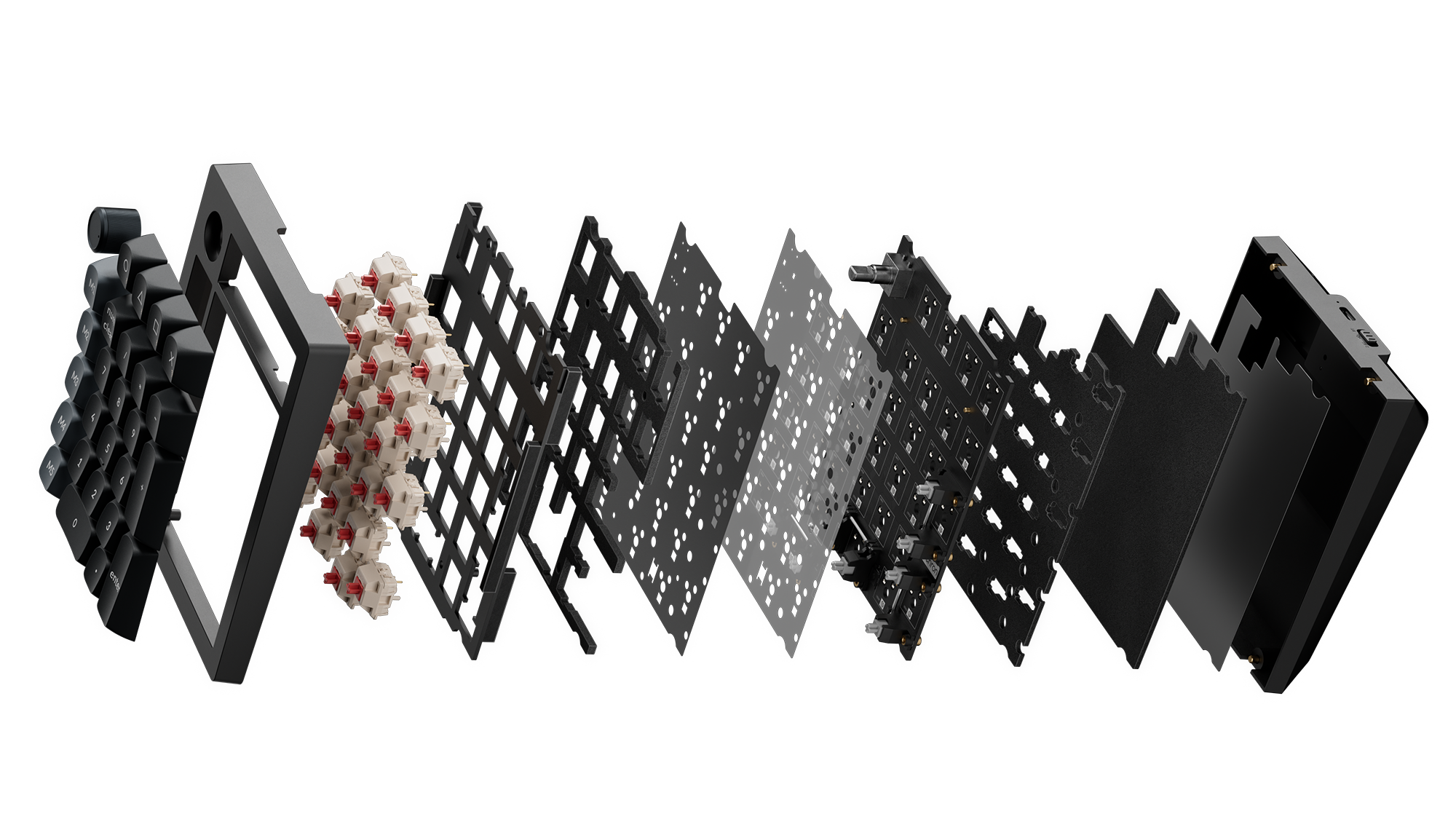 - The keyboard PCB, the case, and the PC plate.