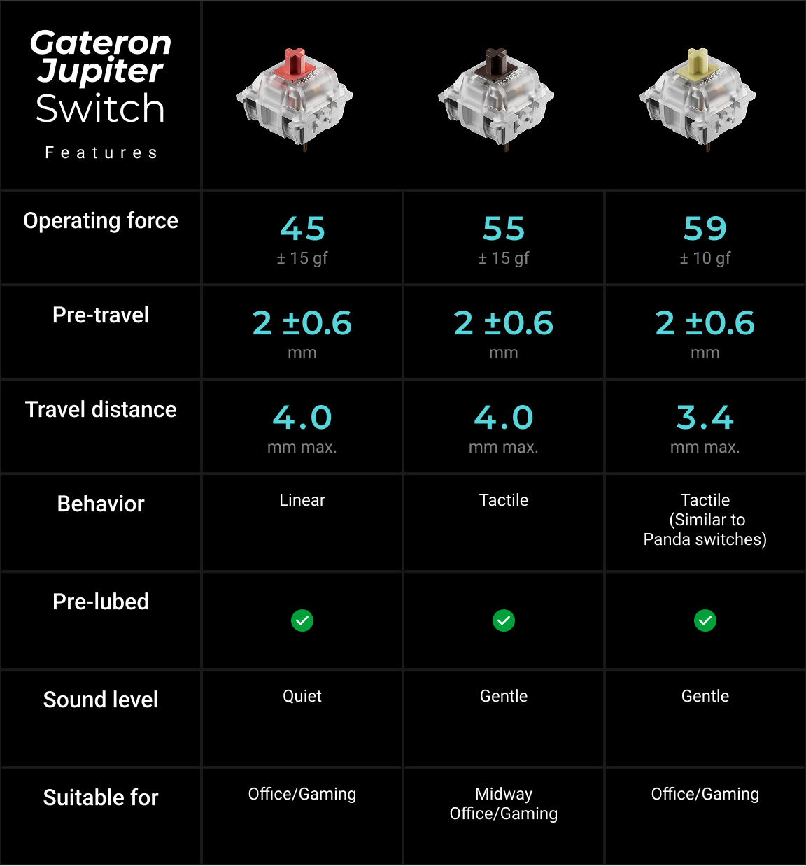 Our exclusive Gateron Jupiter mechanical switch (for the Fully Assembled version only) comes with a 3-pin design, its pre-lubed with a reliable Gateron quality standard with up to 80 million keystrokes lifespan. While their unique LED diffuser design offers high RGB backlight transmittance and softer backlight effect.
