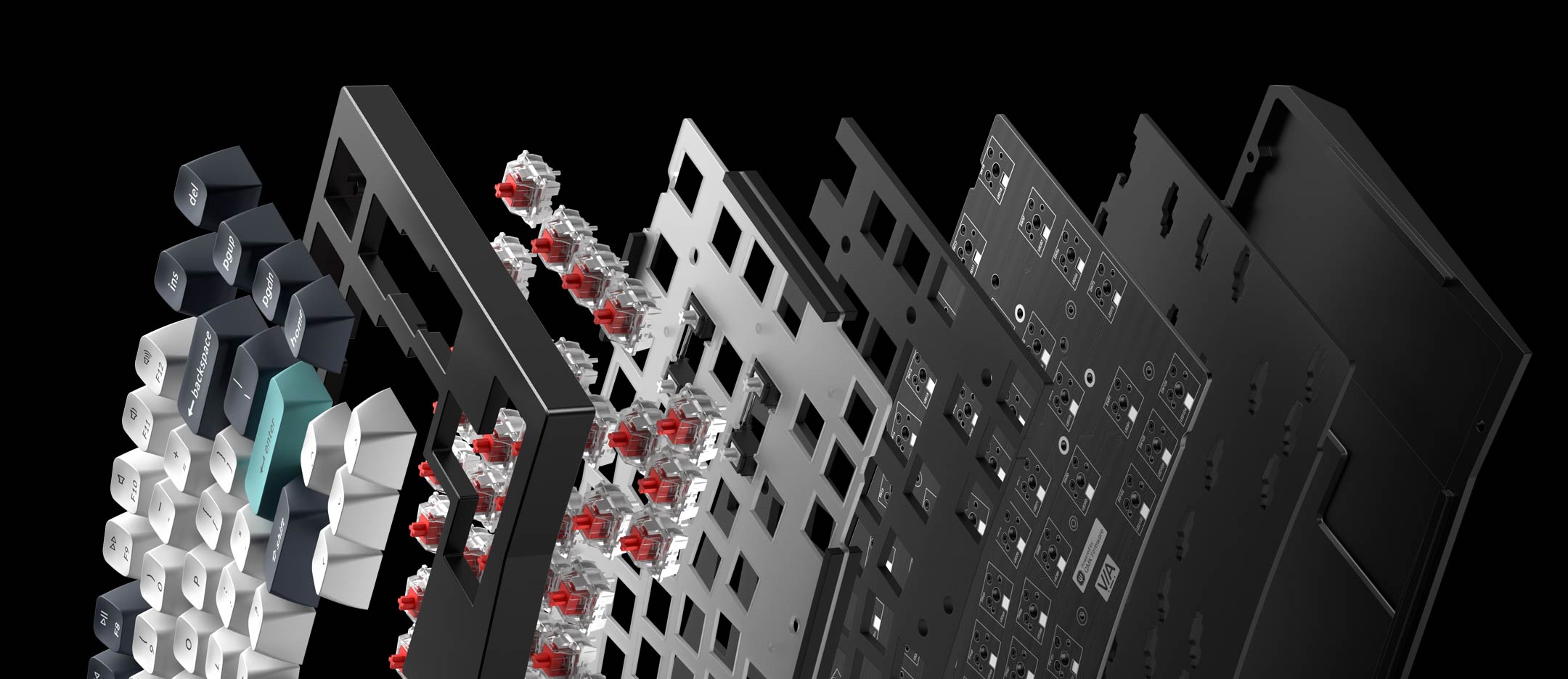 • The keyboard PCB, the case, and the PC plate.