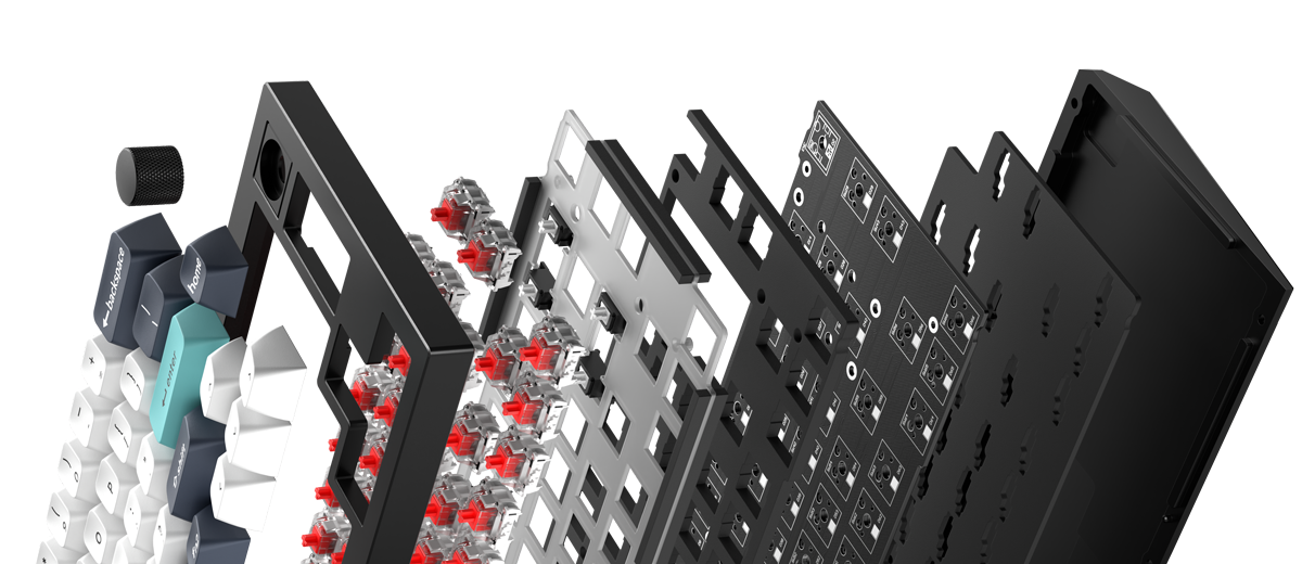 - The keyboard PCB, the case, and the PC plate.