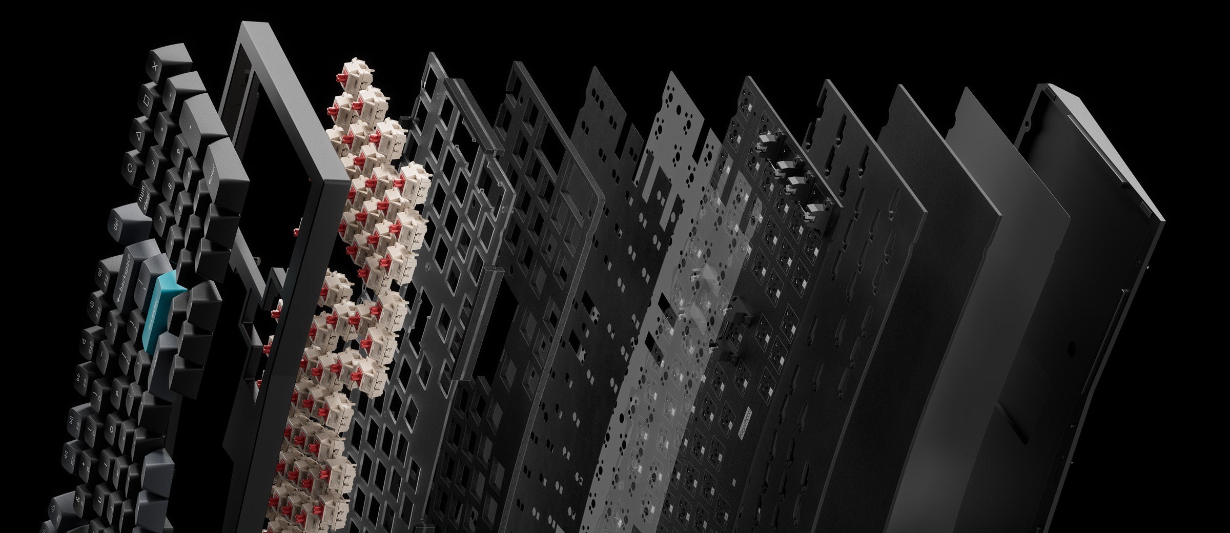 - The keyboard PCB, the case, and the PC plate.