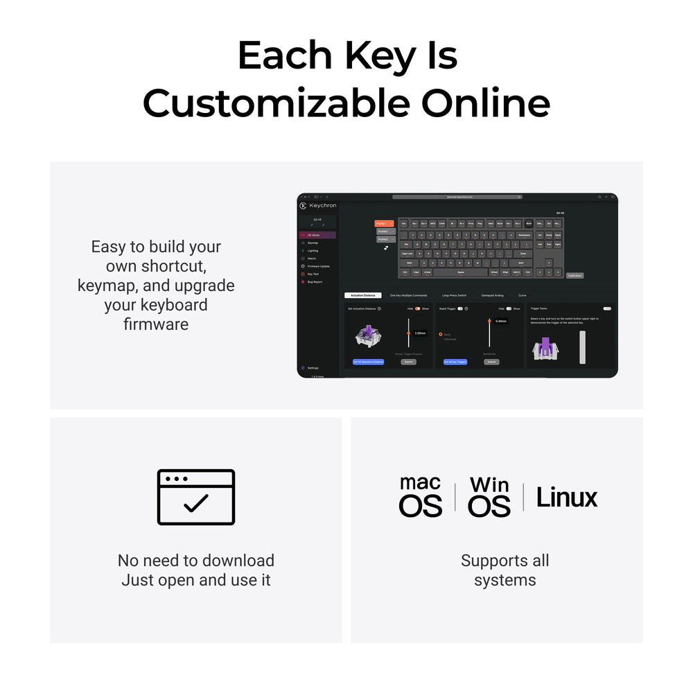 The open-source QMK firmware means endless possibilities for key remapping, macros, shortcuts, and more. With the Keychron Launcher web app, you can effortlessly remap keys, adjust actuation points, set the magnetic switches, create personalized macro commands, shortcuts, and key combinations for each key.