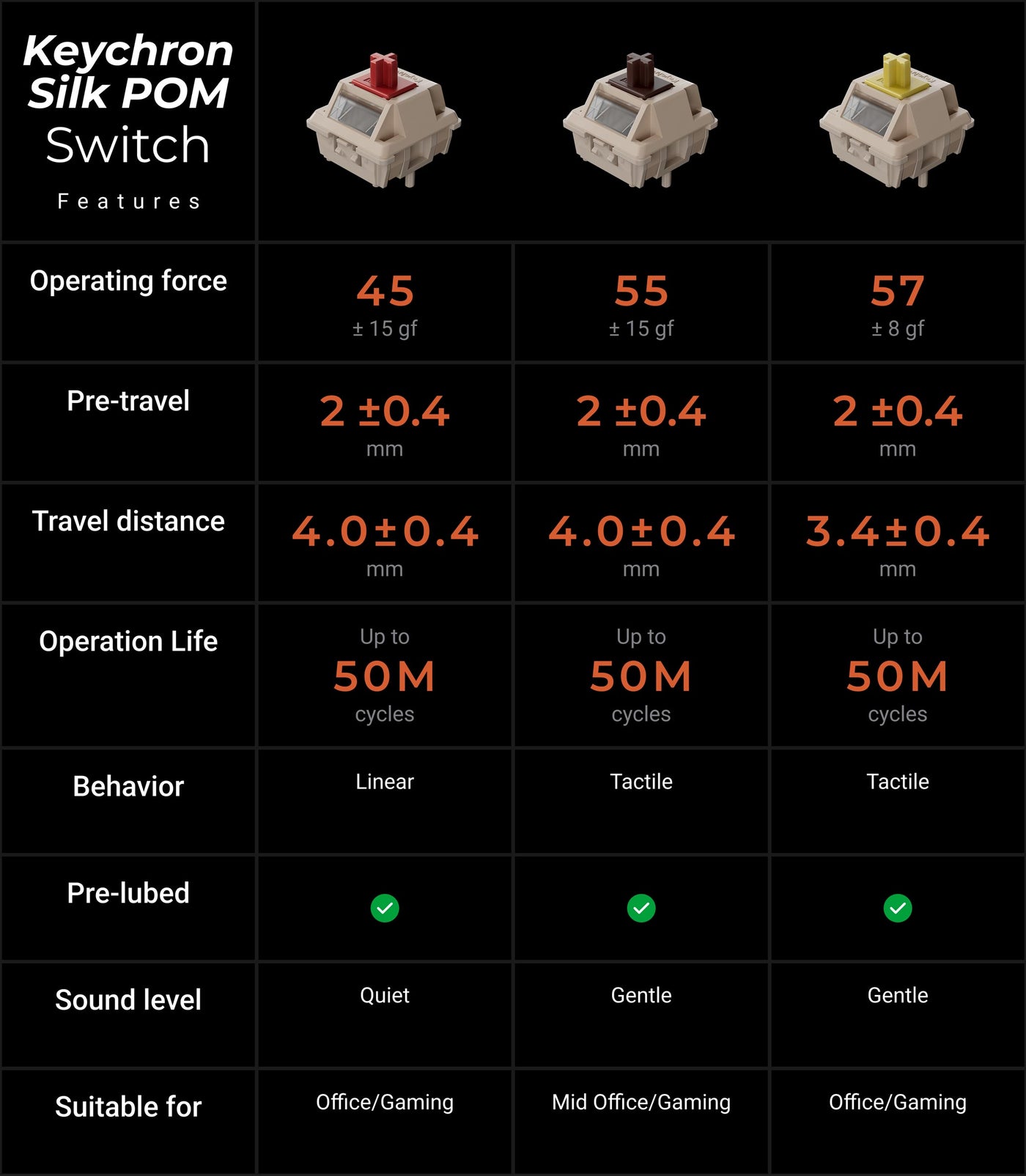 The Keychron V1 Ultra 8K comes with pre-lubed Keychron Silk POM Switch with high-performance designed for gamers and typists who demand precision, durability, and an exceptional typing experience.Crafted from high-quality POM housing and stem, our switches ensure outstanding durability and resistance to wear over time. This premium material provides a smooth and consistent keystroke, enhancing your overall typing experience.